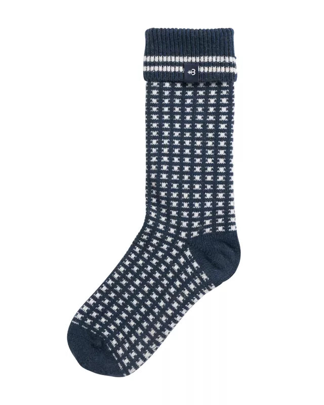 Jacquard-knitted wool blend sock. Ribbed top and classic pattern. The yarn is certified according to GRS, which is a guarantee that the yarn contains a higher minimum amount of recycled material, traceability and additional social and environmental requirements. Produced in Europe.