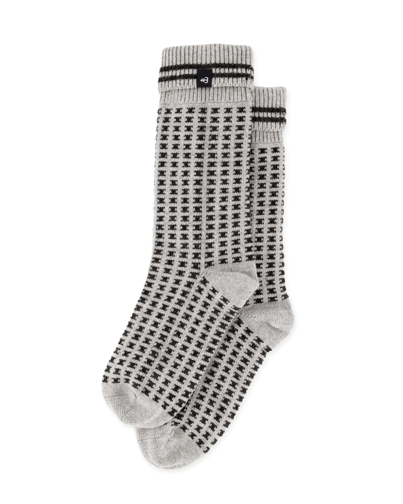Jacquard-knitted wool blend sock. Ribbed top and classic pattern. The yarn is certified according to GRS, which is a guarantee that the yarn contains a higher minimum amount of recycled material, traceability and additional social and environmental requirements. Produced in Europe.